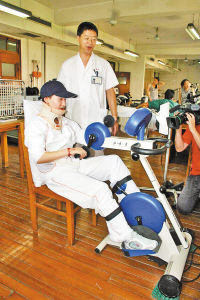 照片:在比赛中不慎受伤的浙江体操选手王燕在上海第六医院康复科进行康复训练。