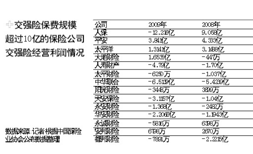 中国保险行业协会数据显示,2009年度国内共有30家经营交强险业务的财险公司,其中14家险企交强险保费规模超过了10亿元。而在这14家险企中,去年实现该项业务盈利的公司只有平安、太平洋财险、大地、安邦财险这四家。国内最大的财险公司人保财险去年交强险亏损12.236亿,而在2008年其还有9.058亿的盈利。有车一族最关心的是交强险会不会调价。对于消费者的疑虑,保监会明确表示,交强险的基础费率还不会调整。