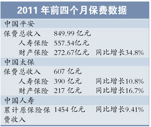 数据显示,4月份,中国人寿保费收入为224亿元,环比下降达41.67%,是连续第三个月保费收入环比下滑。平安寿险实现保费81亿元,由于2010年同期并未公布新准则下寿险保费,所以无法进行同期比较,但是较3月份的155.17亿元环比下降47.64%。中国太保四月单月实现寿险保费67亿元,同比小幅负增长1.47%,环比降35.6%。
