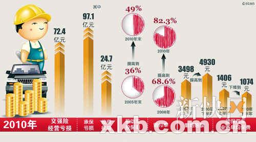 虽然外资进入交强险领域的呼声早在几年前就已开始,但近期再次传出“解禁”消息也有其特殊背景。根据今年保监会发布的《关于2010年度机动车交通事故责任强制保险业务情况的公告》显示,33家经营交强险业务的中资保险公司2010年度交强险业务承保亏损高达97亿元,扣除25亿元的投资收益后,行业亏损仍为72亿元。而交强险开办5年来,仅有2008年实现盈利,而且亏损情况越发严重。
