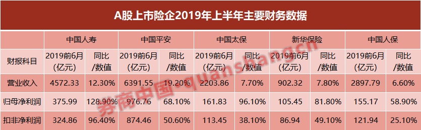迄今,五大A股上市险企均已发布了2019年半年报。受今年手续费税收政策调整利好以及一季度A股市场大幅上涨带动投资收益向好等因素影响,A股上市险企净利润同比大增。