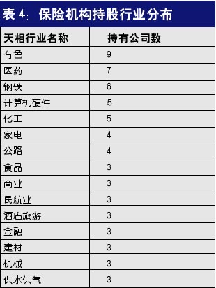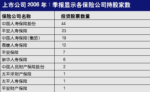 而根据上市公司2006年一季报十大股东名单统计发现,保险机构持有的84只股票分布在28个不同的行业。其中,以持有的有色、医药、钢铁类股票居多,持有公司家数分别达到9家、7家、6家,其他重仓行业还有计算机硬件、化工、家电、公路、食品、商业、民航业、酒店旅游、金融、建材、机械、供水供气等。