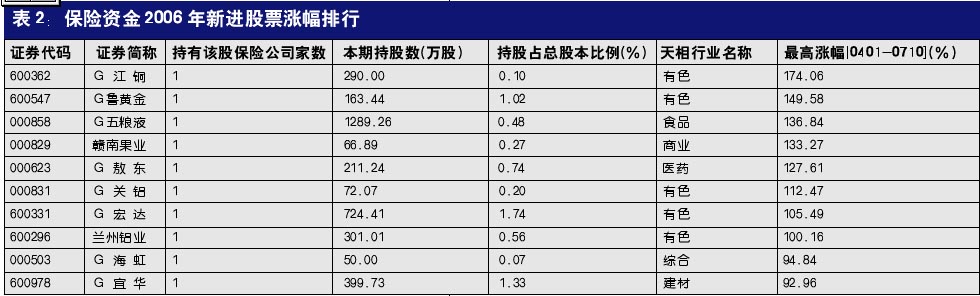 保险资金一直在调整持仓结构,并没有呈现出长期持有的投资风格。数据显示,2006年一季度保险机构较新进和退出的股票均为33家,从新进股票和退出股票的整体平均涨幅上来看,保险资金的调仓换股还是成功的。据统计,保险机构一季度新进的33只股票在4月1日至7月10日区间的平均复权最高涨幅为72%,而一季度退出的33只股票同期平均复权最高涨幅只有52%,新进入的公司以有色金属行业个股居多,可以看出保险机构的“择时”“择股”能力还是比较强的。