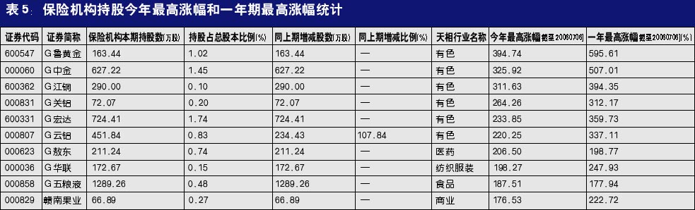 其中,保险资金持股涨幅较大的主要集中在有色金属行业。截至2006年7月6日,保险公司持有股票今年以来最高涨幅前六名的个股分别为:G鲁黄金 G中金 、G江铜 、G关铝 、G宏达 、G云铝 ,最高涨幅均超过了200%,涨幅巨大,为保险机构获利贡献颇多。