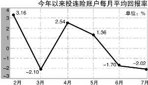 7月,在股市下跌、债市微涨的月份,投连险账户的平均收益率表现却并不理想。华宝证券最新公布的中国投连险月报显示,7月投连险单月平均收益仅为-2.02%,188个账户中有45个账户取得正收益,占比仅有两成多。