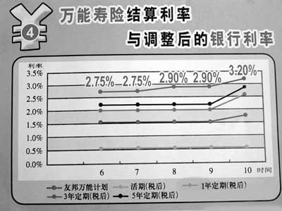 把投资账户回报和存款利率放在了一个曲线图中 友邦保险在银行发放的万能寿险宣传单上,把保险投资账户的回报率和银行利率的数值放在了一个曲线图中,保险业内专家认为,该宣传有误导嫌疑。