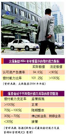 《证券市场周刊》获得了太保集团2004年年报,一位保险分析师向本刊指出,该年报没有公布具体业务数据,包括定期寿险的风险保险额等,但可以说明问题的是,太保集团总的偿付能力比率仅接近100%,偿付能力确实必须提高。如果认可资产分开到财险和寿险而分别计算的话,那么非常有可能其中的财险或寿险的偿付比率低于法定监管标准。从太保集团2004年年报看,太保集团的认可资产负债率为95%,而保监会的监管指标要求小于 90%。