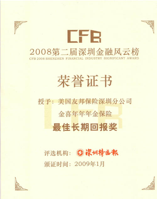 友邦保险“金喜年年”年金保险荣获2008第二届深圳金融风云榜“最佳长期回报奖”