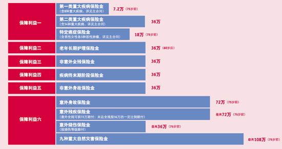 注:身故保险金、疾病终末期阶段保险金、第二类重大疾病保险金、全残保险金及老年长期护理金,仅给付最先发生的一项,最先发生时日以合同约定的时日为准。第一类重大疾病保险金、特定癌症保险金和意外身故保险金、意外残疾保险金、意外烧伤保险金及九种重大自然灾害保险金保障至75岁,其中,如果因意外导致身故、残疾或烧伤,本保险计划下累计给付的保险金额以72万为限。