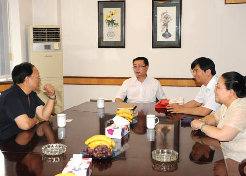 蒋浩宇副总经理向章德基介绍情况 苏州市政协副秘书长、苏州市民主评议政风、行风小组组长章德基在开放日当天也来公司参观职场,并对公司客户节开放职场的活动给予了高度评价。