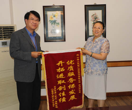 深受客户好评。图为该公司沈丽敏总经理(右)接受客户锦旗。