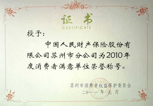 日前,中国人保财险苏州市分公司被苏州市消费者权益保护委员会评为2010年度“消费者满意单位”。