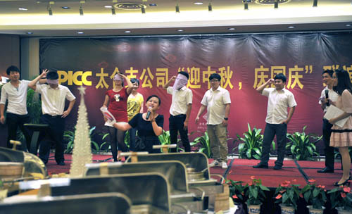 9月27日晚上,太仓人保财险举办的“庆中秋、迎国庆”节日联谊会正在如火如荼的举行,职工们聚在一起,欣赏着员工们自己的联欢晚会。在公司领导的祝酒词中,大家纷纷举起手中的酒杯。晚会上,员工们才华横溢,草根歌星频繁亮相,节目精彩纷呈,大家吃的开心,看的欢乐,个个满载着幸福和欢笑而归。