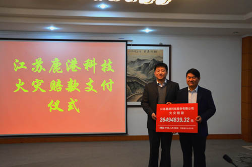 11月22日上午,江苏鹿港科技股份有限公司火灾赔款支付仪式在人保财险张家港中心支公司顺利举行。至此,人保财险张家港中心支公司2013年度最大赔案已基本结束,共计赔付2649.48万元。