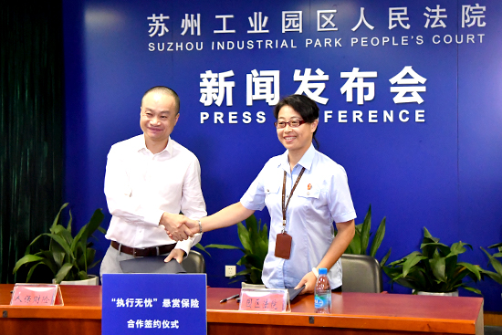 9月15日,人保财险苏州园区支公司联合苏州工业园区人民法院举行新闻发布会,在全市首推“执行悬赏保险”。发布会上,人保财险苏州市分公司副总经理陈嘉与园区法院副院长陈绮签署合作协议,共同推行“悬赏+保险”的新执行模式。人保财险苏州园区支公司经理钱红兵现场同三家客户单位签订了悬赏保险年度统保协议。发布会后,在工业园区人民法院微信公众号上发出的推文《园法执行 | 赏金风暴(第一期)》引爆了朋友圈,其中公布的首批10个案件,共计悬赏7.5万元,这些案件均由园区支公司承保。