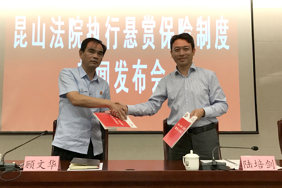 9月28日,人保财险昆山中心支公司联合昆山法院召开执行悬赏保险制度新闻发布会,发动社会力量查找被执行人及其财产线索,全力破解“执行难”问题。会上,昆山人保财险与昆山法院签署“执行无忧”悬赏保险服务合作协议。