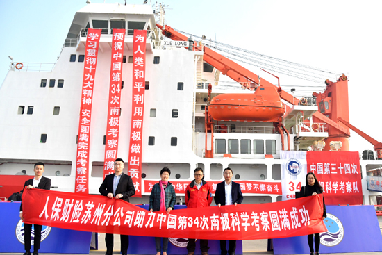 出征仪式前,相城支公司“极地”项目团队专程向本次考察队领队、首席科学家、中国极地研究中心主任杨惠根博士表达了对全体科考人员的敬意和对于本次科考圆满成功的祝福,并送上鲜花和有苏州传统特色的慰问品。杨慧根博士对于人把财险“极地”项目团队专程前来为科考队远征南极送行表示感谢,对长期以来与人保财险的良好合作表示满意,对于南极科考中人保财险提供的全面保险保障及专业优质保险服务给予了高度评价,并欣然与极地团在科考船前合影留念。