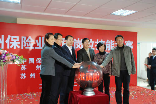 启动仪式上,苏州市总工会朱正荣副主席、苏州市文明办邱惠霞副主任、苏州市公安局交警支队冯炯政委、苏州市金融办张杰处长、苏州保监分局单来锦局长、苏州市保险行业协会张爱华秘书长共同为苏州保险业首届岗位技能大赛启动水晶球。