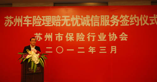 3月7日,苏州车险理赔无忧诚信服务签约仪式在独墅湖会议酒店举办。苏州市金融办赵琨副主任、苏州市社科联韦刚副主席、苏州保监分局单来锦局长和蔡毅钧局长助理出席会议。苏州市保险行业协会张爱华秘书长主持会议。苏州各财险公司总经理和相关负责人参加会议。