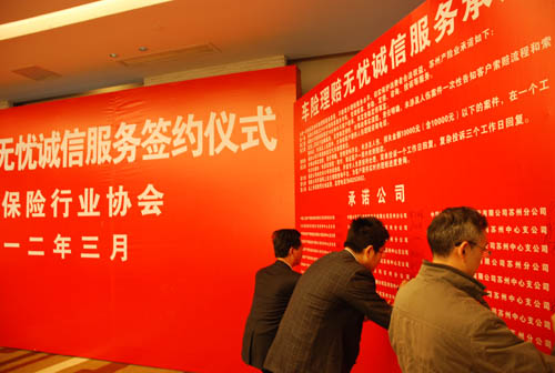 会议首先由苏州协会邹宣戈副会长宣读车险理赔无忧诚信服务承诺倡议书,接下来,27家经营车险的财险公司依次上台签订车险理赔无忧诚信服务承诺。人保财险、太平洋财险、平安财险以及华泰财险总经理分别作为公司代表,上台表态发言,表示将坚决执行车险理赔无忧诚信服务承诺自律公约,规范经营,践信守诺,切实维护保险消费者合法权益。