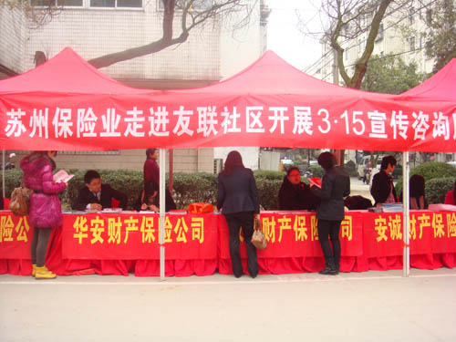 为隆重纪念“3•15”国际消费者权益日,切实维护保险消费者合法权益,3月15日,苏州保险业积极参与苏州市人民政府主办的位于新艺广场的“3•15”国际消费者权益日活动。同时,分别在新康社区、友联社区、龙西社区、养一社区、东环等五大社区举办3•15走进社区大型宣传咨询服务活动。苏州保监分局单来锦局长亲临活动现场,视察指导工作,并在现场接受了苏州电视台及各大新闻媒体的采访,就保险业维护消费者权益、打造诚信文化进行了阐述。全市63家保险公司和部分保险专业中介公司参加了活动。