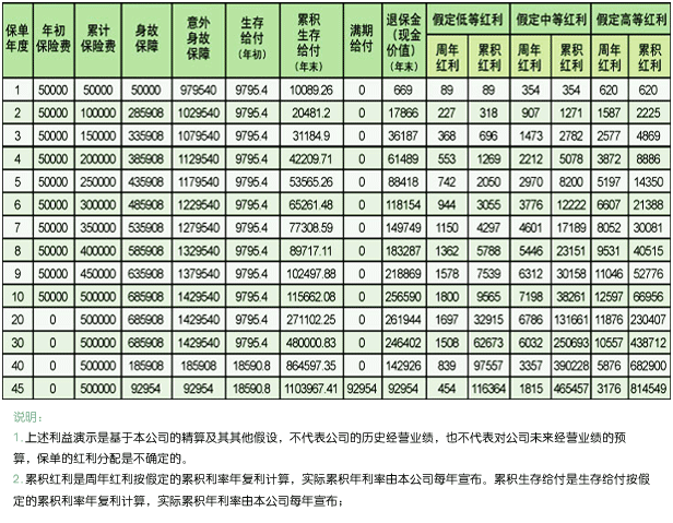 被保险人,张先生,今年30周岁,为自己投保国寿福满一生两全保险(分红型),年交保险费50000元,10年交费,基本保险金额为92954元,福寿金开始领取年龄为60周岁,可获得如下收益: