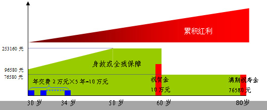 • 林先生,30周岁,公司管理人员,为自己投保20份“金玉人生”,选择60周岁为祝贺金 领取年龄,年交保费20000元,5年限交,基本保险金额76580元,红利累积生息。